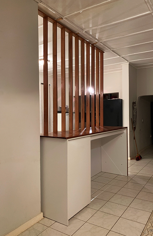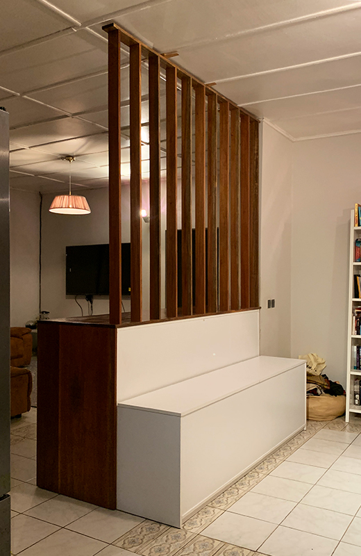 - A room divider that reached ceiling height to subtly separate the space.